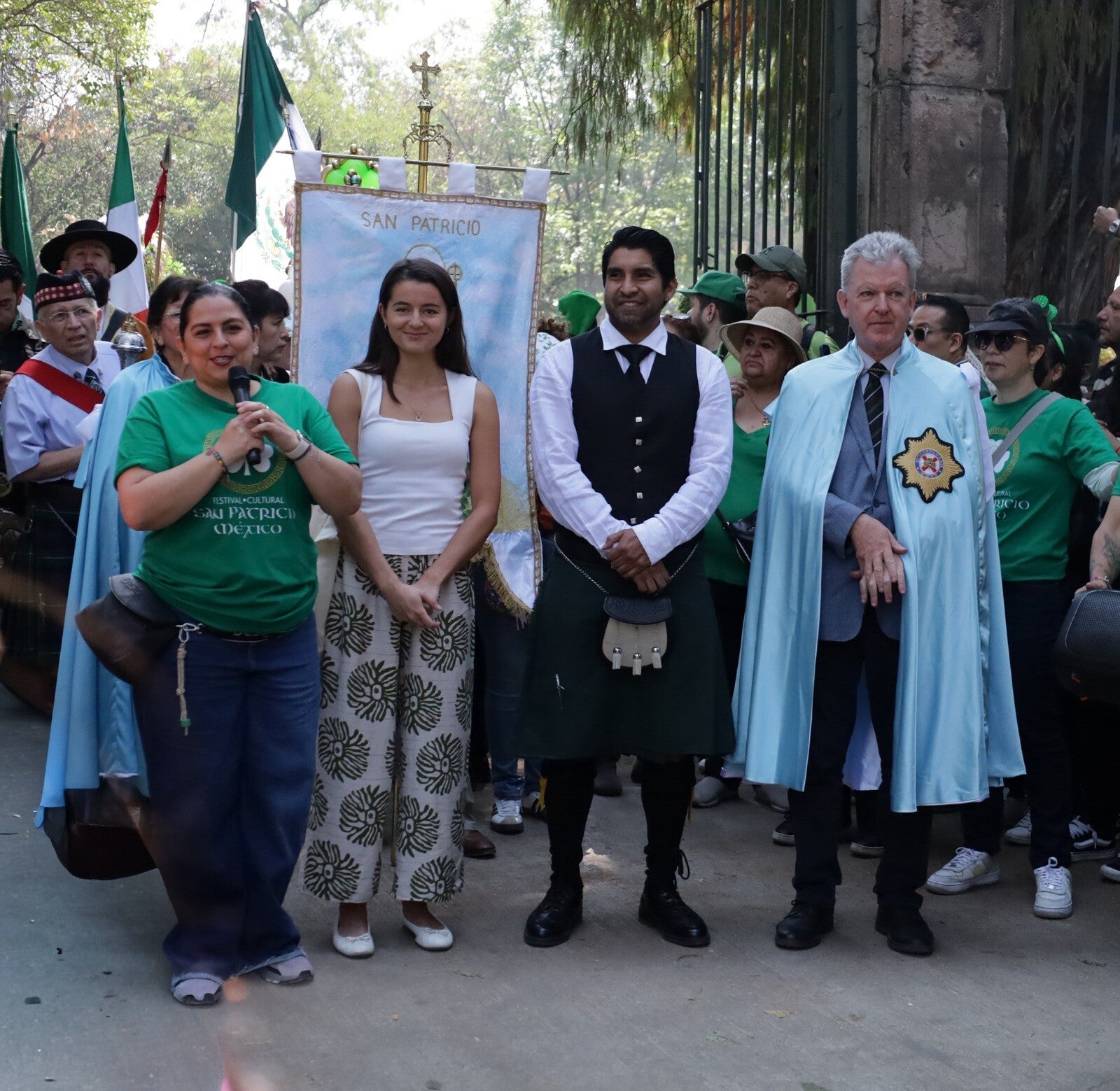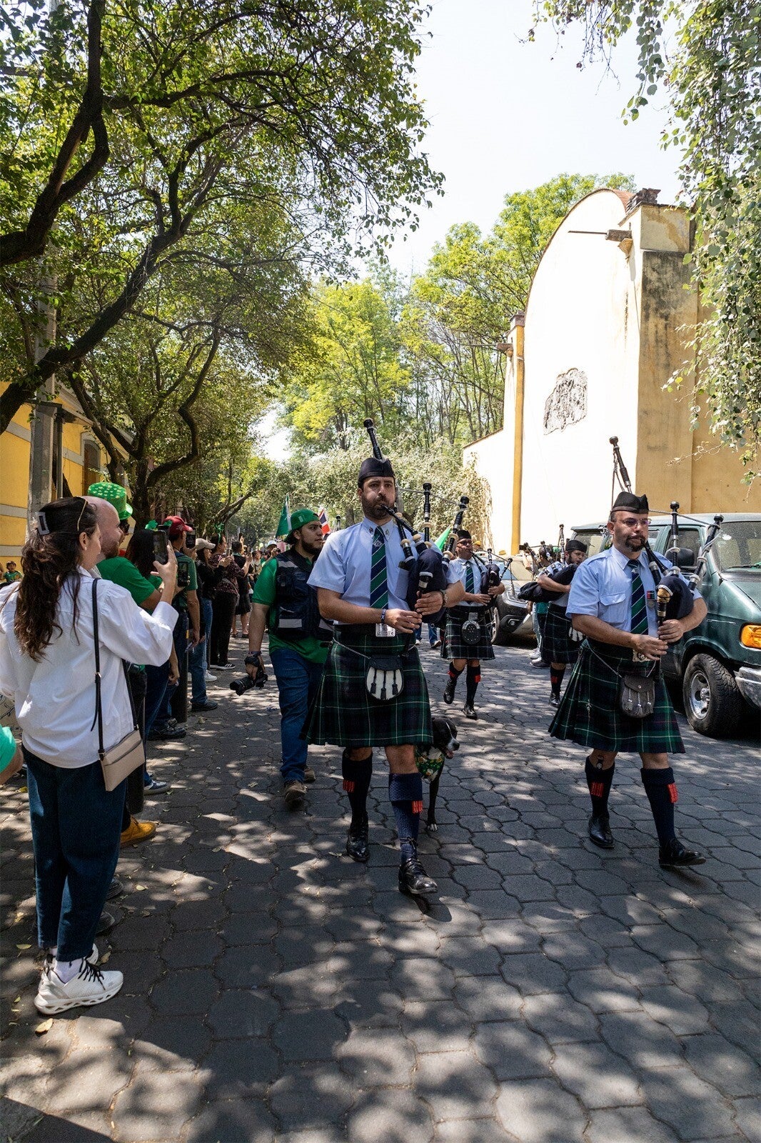 Desde los primeros minutos, el ambiente se volvió electrizante. Las notas de la música celta flotaban en el aire mientras los contingentes avanzaban entre aplausos y miradas curiosas. El verde dominaba la escena: sombreros, capas y detalles que teñían el paisaje urbano y evocaban el espíritu festivo de esta tradición de origen irlandés. Cada paso del desfile parecía marcar el ritmo de una celebración que se sentía tanto en el oído como en la piel.