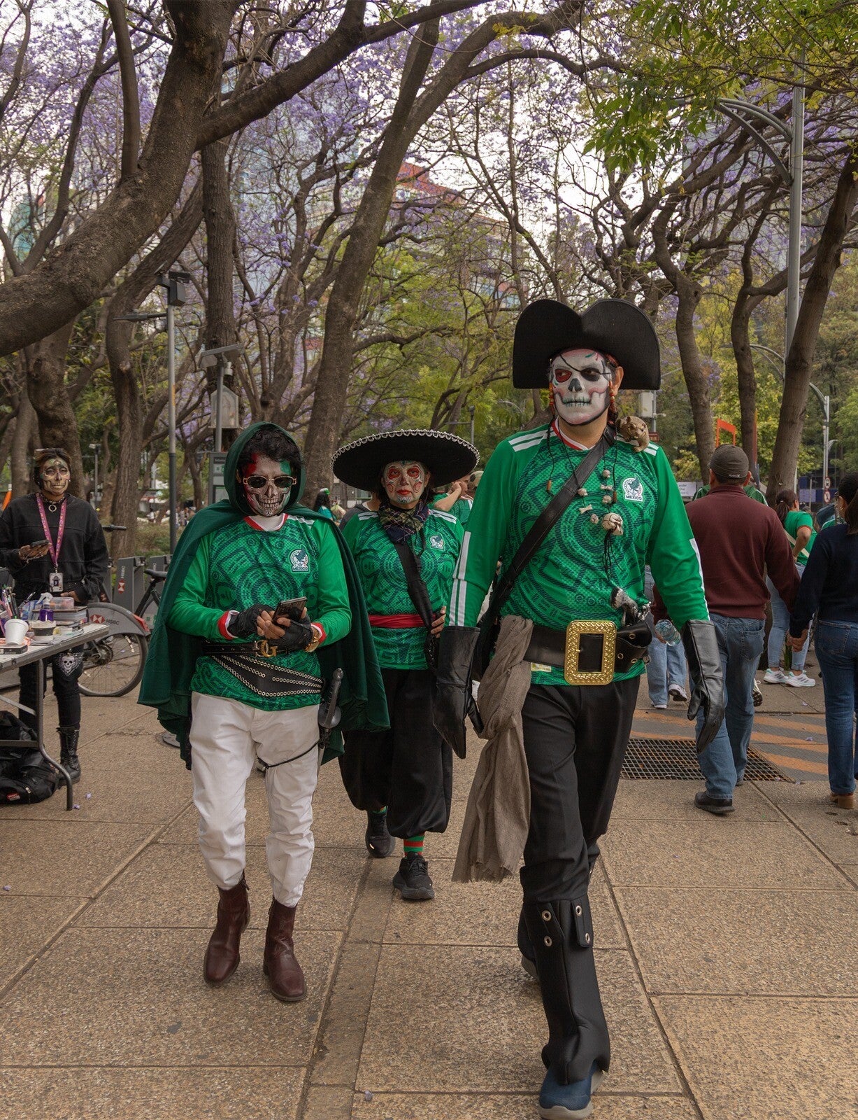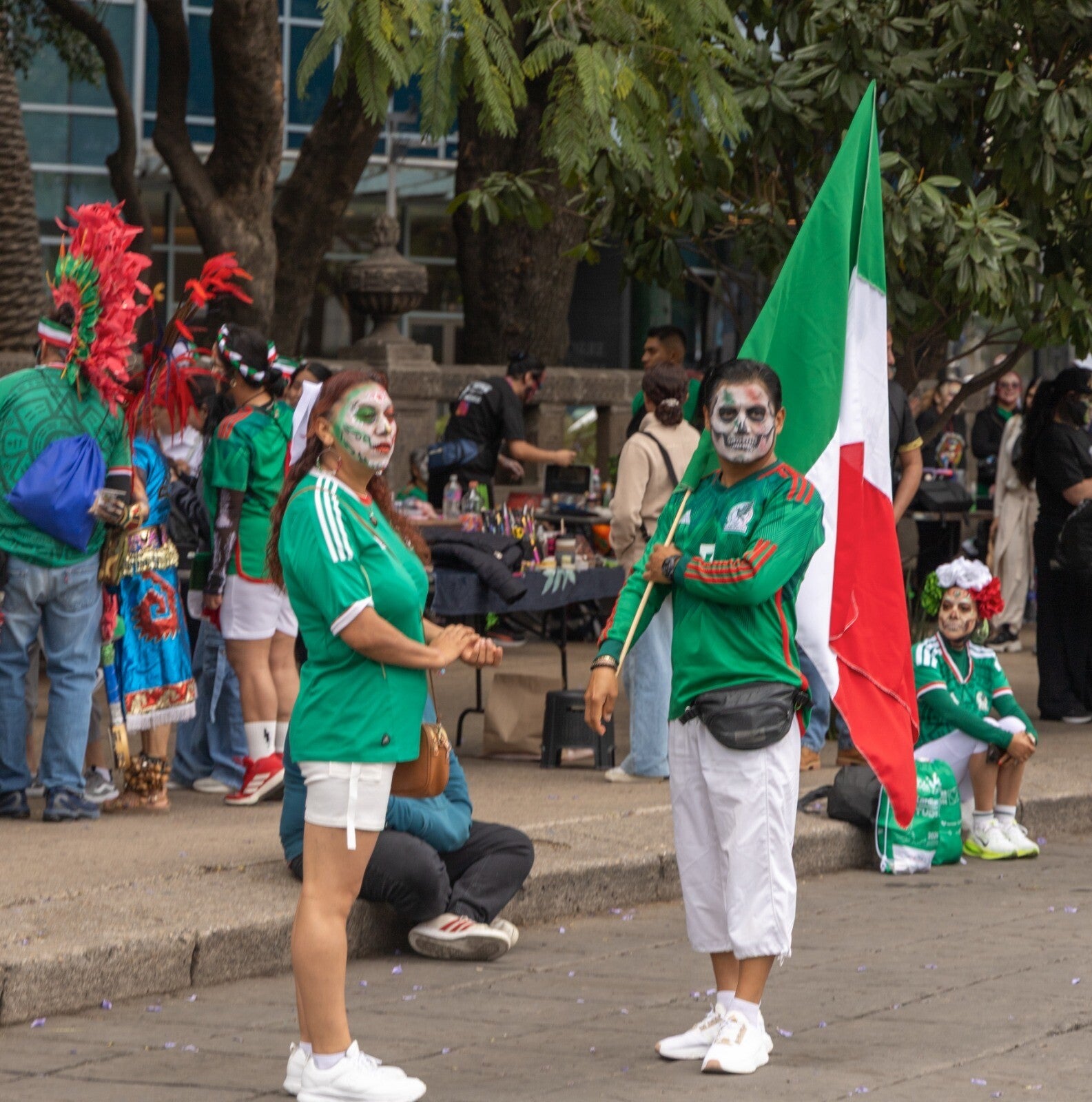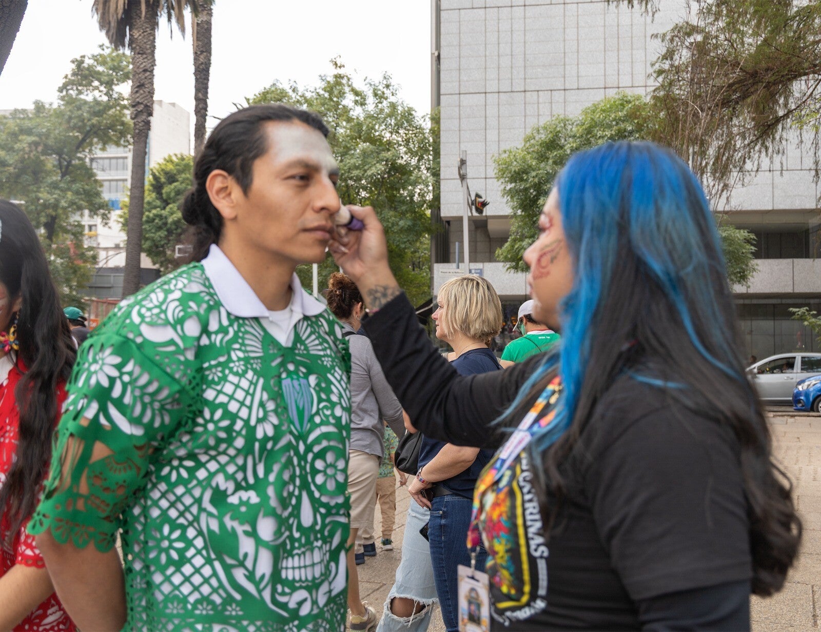 La intervención reunió a decenas de participantes que, caracterizados como catrinas y catrines, dieron vida a una estampa única. La playera verde de la selección mexicana de fútbol dominó la escena como un símbolo de identidad colectiva, resaltando sobre los rostros cuidadosamente intervenidos con maquillaje de calavera. Cada trazo, cada sombra, intensificaba ese contraste entre lo efímero y lo eterno.